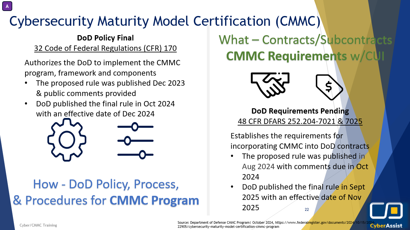 - It sets up the framework, components, policy, and procedures for how the CMMC Program will be implemented and managed